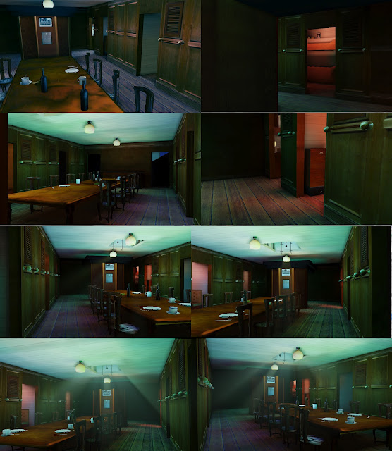 I have decided that it all looks way to warm and cosy to be a frozen ship and I need to change the lighting and colours. I have taken a screenshot into photoshop and played around with the colour balance until I decided on this.
